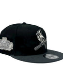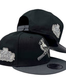 Dedicated to commemorating the illustrious 2011 world series championship journey of the St. Louis Cardinals, this snapback encapsulates the essence of the team's legacy. The all-black color cap with Dark Grey visor. Front logo in silver and white outline symbolizing the Irish spirit and unwavering determination. Baseball bat in metallic silver with black outline. Adorning the left mid-panel is the iconic 2011 world series championship side patch, a testament to four decades of triumphs, challenges, and unforgettable moments in Cardinal's history.