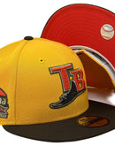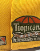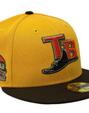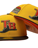 Presenting an exclusive custom Tampa Bay Rays New Era fitted hat from Sports World. 59Fifty high crown cap. It features an all taxi yellow color crown with walnut color visor. front tb logo in yellow with olive green and white outline. Rays logo in brown with toast and olive outline. tropicana field side patch on left mid panel. tonal new era flag on right mid panel. flat MLB batter man in the back. Orange under visor. white sweat band. 100 percent polyester. imported from China.