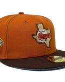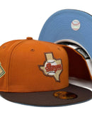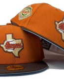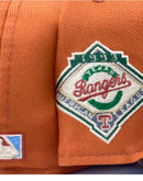 Presenting an exclusive Texas Rangers 1993 Arlington Stadium "Sunset Drip Collection" New Era fitted hat only from Sports World. 59Fifty high crown cap. It features all rust orange color crown with brown visor. Front logo in camel, white and rust orange with brown outline. 1993 Arlington stadium side patch on right mid panel. Tonal new era flag on left mid panel. Flat MLB batter man in the back. Sky blue under visor. White sweat band. 100 percent polyester. Imported from Laos.