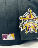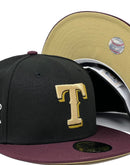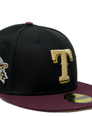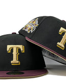Presenting an exclusive custom Texas Rangers 1995 all-star game fitted hat from Sports world. 59Fifty high crown cap. It features all black color cap with maroon visor. front logo in Vegas gold with black and gold outline. 1995 all-star game side patch in maroon, black and Vegas gold. tonal new era flag on right mid panel. flat MLB batter man in the back. Vegas gold under visor. white sweat band. 100 percent polyester. imported from China.