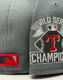 Introducing a unique custom Texas Rangers 2023 world series champions New Era fitted hat from Sports World. The 59Fifty high crown fitted hat is designed with a sleek all dark gray color cap with black visor that provides a bold contrast to the classic design.