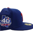Custom new era fitted. 100% wool. all Royal cap. front logo in red. 40th anniversary side patch. gray under visor.