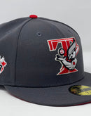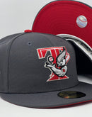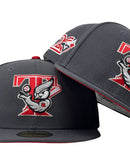 Presenting an exclusive custom Toronto Blue Jays 20th anniversary New Era fitted hat from Sports World. 59Fifty high crown. it features all dark gray color cap.  Front logo in red with metallic silver outline. bird in light gray with black outline. 20th anniversary side patch in red, black with metallic silver outline. tonal new era flag on right mid panel. flat MLB batter man in the back. red under visor. white sweat band. 100 percent polyester. imported from China.