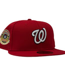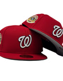 The cap boasts a sophisticated and timeless design, with a red color cap that exudes elegance and confidence. The contrasting gray under visor adds a touch of flair, making it an eye-catching piece that perfectly complements any outfit. The front logo features a bold white emblem with a striking navy blue outline, symbolizing the Nationals' vibrant spirit and unwavering determination.