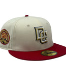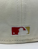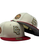 The cap boasts a sophisticated and timeless design, with an off-white color cap with red visor that exudes elegance and confidence. The contrasting gray under visor adds a touch of flair, making it an eye-catching piece that perfectly complements any outfit. The front logo features a bold metallic gold and white with navy blue outline, symbolizing the Nationals' vibrant spirit and unwavering determination.