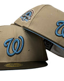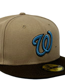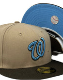 Presenting an exclusive Washington Nationals New Era fitted only from Sports World. 59Fifty high crown cap. It features an all-camel/ tan color crown with brown visor. front logo in sky blue with brown outline. 25th anniversary side patch on left mid panel in sky blue, white and brown with metallic copper outline. tonal new era flag on right mid panel. flat MLB batter man in the back. sky blue under visor. white sweat band. 100 percent polyester. Imported from China.