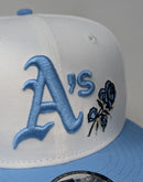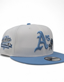 Introducing a unique custom Oakland Athletics 89 world series gray brim New Era Snapback hat from Sports World. The 9Fifty high crown Snapback hat is designed with a sleek White and sky blue visor color cap that provides a bold contrast to the classic design.