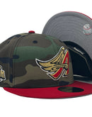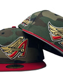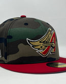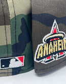 Introducing a unique custom Anaheim Angels gray brim new era fitted hat from Sports World. The 59Fifty high crown fitted hat is designed with a sleek all green camo color crown and a stylish red visor that provides a bold contrast to the classic design.
