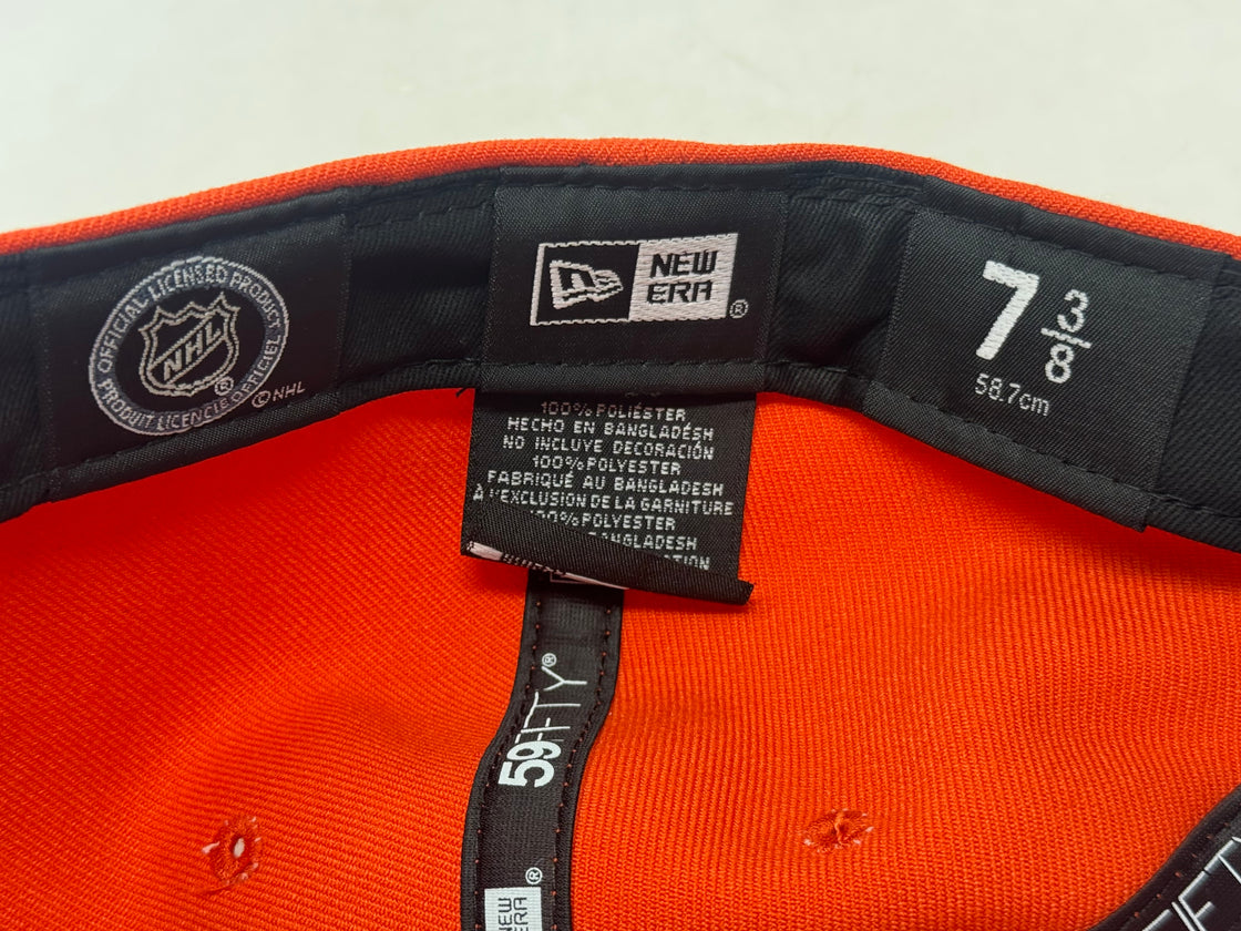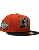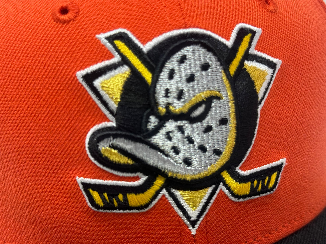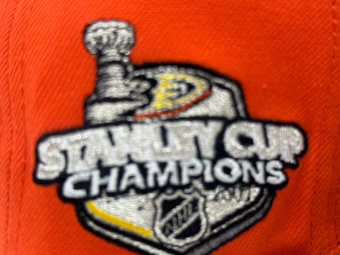 Celebrate 2007 Stanley cup championship with the Anaheim Ducks 59FIFTY New Era Fitted Hat. This expertly designed combines timeless style with premium craftsmanship, making it a standout addition to any fan's collection. The bold orange color cap with black visor is complemented by striking metallic details, including the iconic Anaheim Ducks logo on the front and a meticulously embroidered 2007 Stanley cup championship side patch. Designed with comfort and durability in mind, this hat is perfect for showcasing your team pride while maintaining a sleek and sophisticated look.