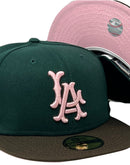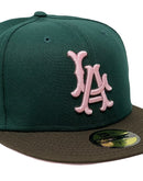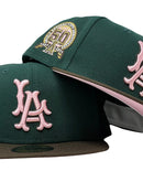 Presenting a custom New Era fitted hat exclusively from Sports World. 59fifty high crown cap. it features an all-dark green color crown with brown visor. front logo in light pink with brown outline. 50th anniversary side patch on left mid panel in pink, brown and metallic gold with white outline. tonal new era flag on right mid panel. Flat MLB batter man in the back. pink under visor. white sweat band. 100 percent polyester. imported from China.
