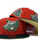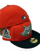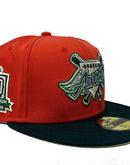 Presenting a custom New Era fitted hat exclusive from Sports World. 59fifty high crown cap. it features an all-orange color crown with dark green visor. front logo in green, soft yellow with black and white outline. 50th anniversary side patch on left mid panel in green, black and white with soft yellow outline. tonal new era flag on right mid panel. Flat MLB batter man in the back. soft yellow under visor. white sweat band. 100 percent polyester. imported from Bangladesh.