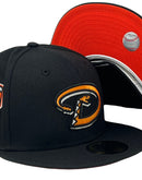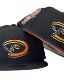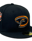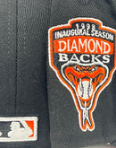 Presenting an exclusive Arizona Diamondbacks 1998 inaugural season custom New Era fitted hat from Sports World. 59Fifty high crown cap. It features all black color cap. Front logo in orange with black and white outline. 1998 inaugural season side patch on left mid panel. tonal new era flag on right mid panel. flat MLB batter man in the back. Orange under visor. White sweat band. 100 percent polyester. imported from Laos.