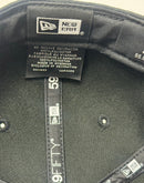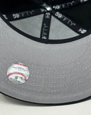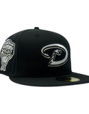 This 59Fifty high crown cap features a unique and stylish design, with an all-black color cap. The front logo is white with black and metallic silver outline, making it stand out from other Diamondbacks hats. The 1998 inaugural season side patch on the left mid-panel adds a special touch to the hat, while the tonal New Era flag on the right mid-panel completes the design.