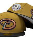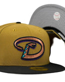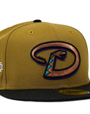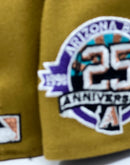 This 59Fifty high crown cap features a unique and stylish design, with an all old school gold color cap and a contrasting black visor. The front logo in metallic copper with purple and calypso green outline, making it stand out from other Diamondbacks hats. The new 25th anniversary side patch on the left mid-panel adds a special touch to the hat, while the tonal New Era flag on the right mid-panel completes the design.