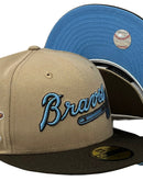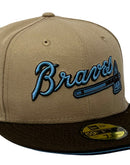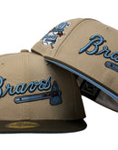 Presenting an exclusive Atlanta Braves New Era fitted hat from sports world. 59Fifty high crown cap. It features a camel/tan color cap with brown visor. Front Braves logo in script, sky blue with brown outline. 30th anniversary side patch in left mid panel. Tonal New Era flag on right panel. Flat MLB batter man in the back. sky blue under visor. white sweat band. 100 percent polyester. imported from China.