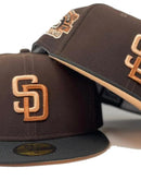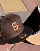 Deep Brown San Diego Padres Stadium Peach brim Custom New Era fitted hat from Sports World. 59Fifty high crown cap. Dark brown color cap with black visor. Padres Stadium side...