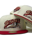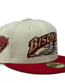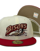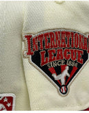 Presenting an exclusive custom New Era fitted hat only from Sports World. 59Fifty high crown cap. it features an all-off white color cap with red visor. from logo in red, black, Chevrolet gold. Minor league international side patch on right mid panel. tonal new era flag on left mid panel. MILB batter man in the back. stone under visor. white sweat band. 100 percent polyester. imported from China.