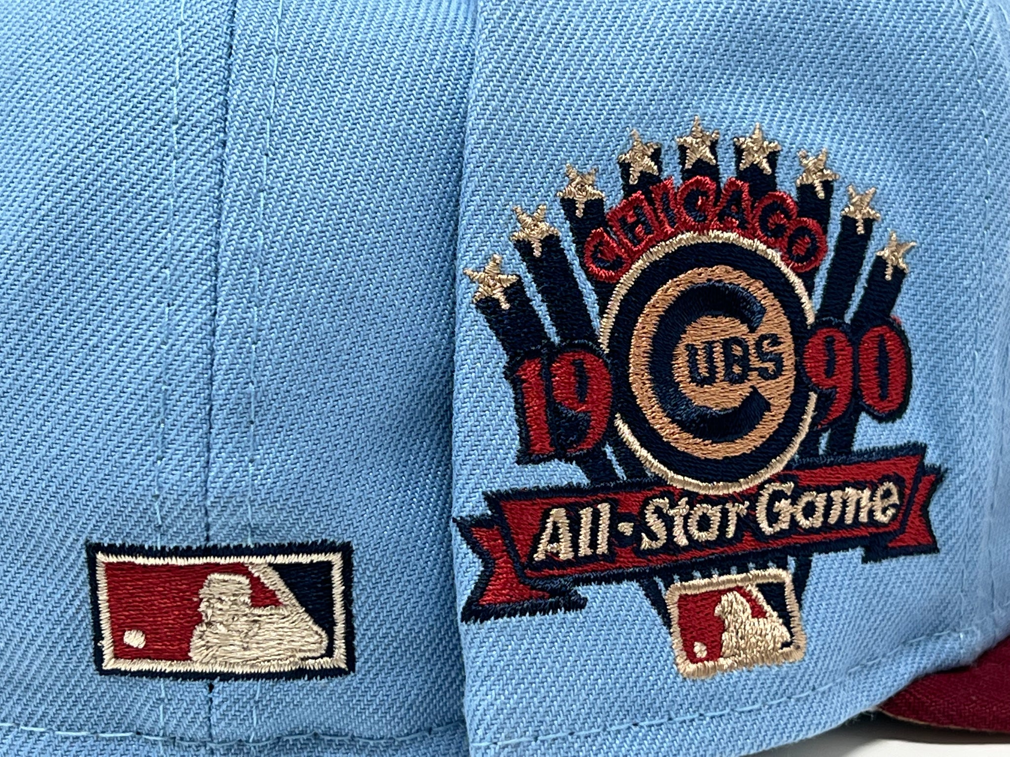 Presenting an exclusive custom Chicago Cubs 1990 all-star game cap toast brim New Era fitted hat from sports world. 59Fifty high crown cap. It features a sky-blue color cap with burgundy visor. Front Cubs logo in burgundy, navy and toast. 1990 all-star game side patch in left mid panel. Tonal New Era flag on right panel. Flat MLB batter man in the back. camel under visor. white sweat band. 100 percent polyester. imported from Bangladesh.