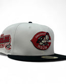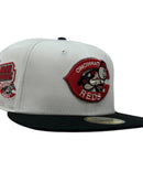 Introducing a unique custom Cincinnati Reds gray brim new era fitted hat from Sports World. The 59Fifty high crown fitted hat is designed with a sleek all-white color cap with black visor. The front logo in red and black with metallic silver outline is the perfect representation of the team, giving it a modern and stylish appeal that any Reds fan would love.