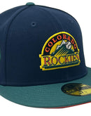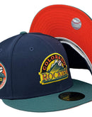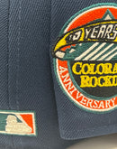 Presenting an exclusive custom Colorado Rockies 10th anniversary fitted hat only from Sports World. 59Fifty high crown cap. It features a light navy-blue color cap with aqua green visor. Front logo in yellow, black, orange and green. 10th anniversary side patch on left mid panel. tonal new era flag on right mid panel. flat MLB batter man in the back. orange under visor. white sweat band. 100 percent polyester. imported from China.