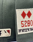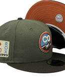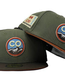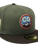 Presenting an exclusive custom Colorado Rockies new City connect logo New Era fitted hat only from Sports World. 59Fifty high crown cap. It features an all-olive green color cap with brown visor. Front logo in brown, sky blue and off-white with rust orange outline. City Connect logo side patch on left mid panel. tonal new era flag on right mid panel. flat MLB batter man in the back. rust orange under visor. white sweat band. 100 percent polyester. imported from China.
