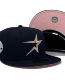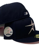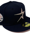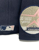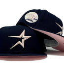 Custom new era fitted hat exclusively for sports world. it features all navy cap. front logo in light pink with metallic silver outline. 35th anniversary side patch. flat MLB batter man in the back. pink under visor. white sweat band. 100 percent polyester.