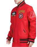 Lined with quilting collar that stands up two pockets in front two pockets inside hefty coat appropriate for chilly weather appliqué that is heat-sealed and has elevated embroidery detail Heat-sealed chenille detail on felt applique 100% Polyester: full zip with snap overlays at the top and bottom.