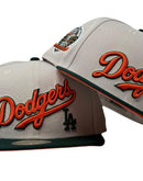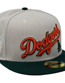 Presenting an exclusive custom "Los Angeles Dodgers 60th anniversary New Era fitted hat only from Sports world. 59Fifty high crown cap. it features an all-stone color crown with dark green visor. front script Dodgers logo in orange with green outline. LA logo in green. 60th anniversary side patch left mid panel. tonal new era flag on right mid panel. flat MLB batter man in the back. orange under visor. white sweat band. 100 percent polyester. imported from Laos.