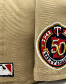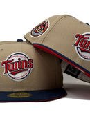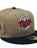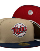 Presenting a custom New Era fitted hat exclusively from Sports World. 59fifty high crown color cap. it features an all-camel color crown with navy visor. front Twins logo in red with navy and white outline. 50TH Seasons side patch on left mid panel in navy and red with metallic gold and white outline. tonal new era flag on right mid panel. Flat MLB batter man in the back. red under visor. white sweat band. 100 percent polyester. imported from Bangladesh.