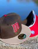 Presenting a custom New Era fitted hat exclusively from Sports World. 59fifty high crown color cap. it features an all-brown color crown with camel visor. front Twins "M" logo in red with toast outline. 50TH Seasons side patch on left mid panel in toast and red with brown and white outline. tonal new era flag on right mid panel. Flat MLB batter man in the back. red under visor. white sweat band. 100 percent polyester. imported from Bangladesh.