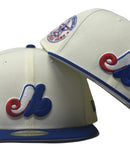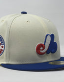 Introducing a unique Montreal expos gray brim New Era fitted hat from Sports World. The 59Fifty high crown fitted hat is designed with a sleek all off-white color cap with royal blue visor that provides a bold contrast to the classic design.