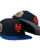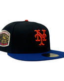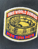 This 59Fifty high crown cap features a unique and stylish design, with a black color cap with a royal-blue visor. The front logo is orange, making it stand out from other Mets hats. 1969 World Series logo on the left mid-panel adds a special touch to the hat, while the tonal New Era flag on the right mid-panel completes the design.