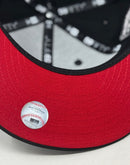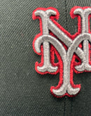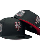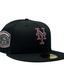 This 59Fifty high crown cap features a unique and stylish design, with a black color cap. The front logo in metallic dark gray with metallic red outline, making it stand out from other Mets hats. 1969 world series logo on the left mid-panel adds a special touch to the hat, while the tonal New Era flag on the right mid-panel completes the design.