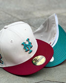 Presenting an exclusive New York Mets New Era fitted hat only from Sports World. 59Fifty high crown cap. It features an all-stone color crown with burgundy visor. front logo in teal with toast and burgundy outline. 40th anniversary side patch on left mid panel. Front and side patch logo in teal, burgundy and toast. tonal new era flag on right mid panel. flat MLB batter man in the back. teal under visor. white sweat band. 100 percent polyester. imported from China.