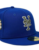 Presenting an exclusive Global Release " Botanical Pack" New York Mets 50th anniversary green brim New Era fitted hat. 59Fifty high crown cap. It features all royal blue color cap. front logo in olive green with white outline. 50th anniversary side patch on left mid panel, Botanical pattern on top of the 50th anniversary side patch. white new era flag on right mid panel. flat MLB batter man in the back. green under visor. black sweat band. 100 percent polyester. imported from Bangladesh.