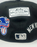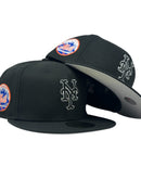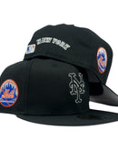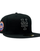 The Alpha Industries x New York Mets BlackΒ 59FIFTY Fitted Cap features an embroidered black and white Mets logo at the front panels with a signature Alpha Industries red ribbon at the left-wear side and an alternate team logo at the right-wear side. Additional details include a woven New Era Cap x Alpha Industries tag above a team color MLB Batterman logo at the rear with a National League patch to the left and a team wordmark to the right.