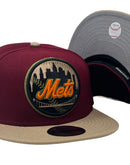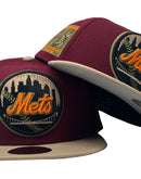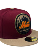 This 59Fifty high crown cap features a unique and stylish design, with all light burgundy color cap and a contrasting tan/camel visor. The front circle Mets logo in black, olive, toast and orange, making it stand out from other Mets hats. 40th anniversary Shea stadium logo on the left mid-panel adds a special touch to the hat, while the tonal New Era flag on the right mid-panel completes the design.