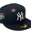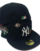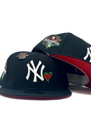 Juneteenth special custom release, 59Fifty New Era fitted hat from sports world. it features all black cap. front logo in white with red heart. 2000 world series side patch in red, white green. Flat MLB batter man in the back. red under visor. white sweat band. 100 percent wool. imported from Bangladesh.