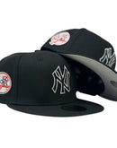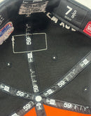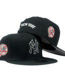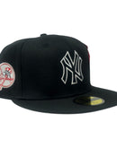 The Alpha Industries x New York Yankees BlackΒ 59FIFTY Fitted Cap features an embroidered black and white Yankees logo at the front panels with a signature Alpha Industries red ribbon at the left-wear side and an alternate team logo at the right-wear side. Additional details include a woven New Era Cap x Alpha Industries tag above a team color MLB Batterman logo at the rear with an American League patch to the left and a team wordmark to the right.