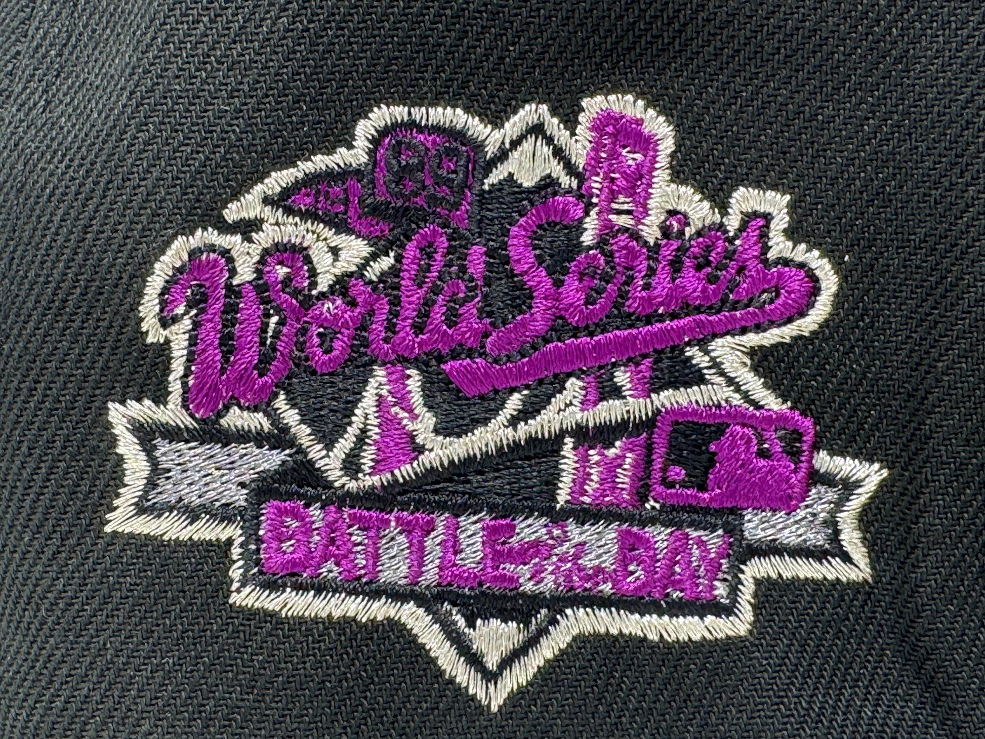 Introducing a unique custom Oakland Athletics 1989 world-series deep purple brim New Era fitted hat from Sports World. The 59Fifty high crown fitted hat is designed with a sleek all-black color cap that provides a bold contrast to the classic design. The front logo in grape Purple. 1989 world-series game side patch on the left mid-panel adds a unique touch to the design, commemorating a special moment in the team's history. Flat MLB batter man in the back. Black sweat band. 100 percent polyester. imported from Laos.