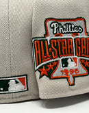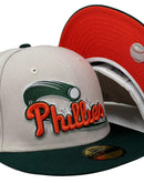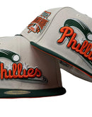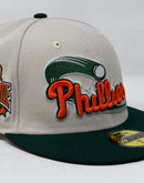 Presenting an exclusive custom Philadelphia Phillies New Era fitted hat only from Sports World. 59Fifty high crown cap. It features an all-Stone color crown with dark green visor. front script Phillies logo in orange and green with white outline. 1996 all-star game side patch on left mid panel in green, orange and white. tonal new era flag on right mid panel. flat MLB batter man in the back. orange under visor. white sweat band. 100 percent polyester. Imported from Laos.