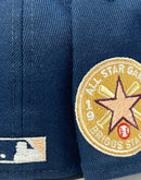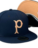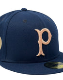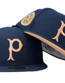 Presenting an exclusive custom old school Pittsburgh Pirates New era fitted exclusively from Sports world. 59Fifty high crown. It features all Light navy-blue color cap. Front logo in peach. 1941 all-star game side patch in peach with metallic copper outline. star in metallic copper and baseball logo in peach. Tonal new era flag on right mid panel. flat MLB batter man in the back. peach under visor. White sweat band. 100 percent polyester. Imported from Laos.