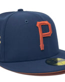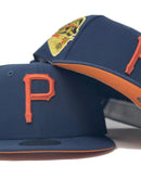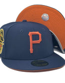 Introducing a unique custom Pittsburgh Pirates 1959 All star Game rust orange brim New Era fitted hat from Sports World. The 59Fifty high crown fitted hat is designed with a sleek all light navy blue color cap that provides a bold contrast to the classic design.