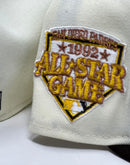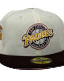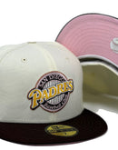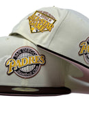 Presenting an exclusive custom 1992 All-star game San Diego Padres New Era fitted hat only from sports world. 59Fifty high crown cap. It features an all-off white color cap with brown visor. Front logo in brown, white and yellow withΒ metallic copper outline. 1992 all-star game side patch on left mid panel.Β tonal new era flag on right mid panel. flat MLB batter man in the back. pink under visor. white sweat band.100 percent polyester. imported from China.