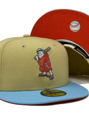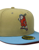 Presenting an exclusive custom design New Era Fitted hat only from Sports World. 59Fifty high crown cap. it features all Vegas gold color cap with sky blue visor. front logo in orange with sky outline. baseball bat in metallic gold. 1992 all star game side patch on right mid panel. tonal new era flag on left mid panel. Flat MLB batter man in the back. orange under visor. white sweat band. 100 percent polyester. imported from Bangladesh.
