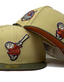 Presenting an exclusive custom New Era fitted hat from Sports World. 59Fifty fitted hat. it features a vegas gold crown with olive green visor. front logo orange and olive green and metallic gold outline. 40th anniversary side patch on left mid panel. tonal new era flag on right mid panel. flat MLB batter man in the back. orange under visor. white sweat band. 100 percent polyester. imported from Bangladesh.