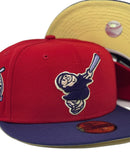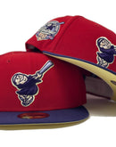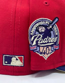 Presenting an exclusive "Tulip collection" New Era fitted hat only from Sports World. 59Fifty high crown cap. It features a red color crown with purple visor. from Padres logo in purple with soft yellow outline. baseball bat in lavender with purple outline. 40th anniversary side patch on right mid panel. tonal new era flag on left mid panel. Flat MLB batter man in the back. butter popcorn soft yellow under visor. white sweat band. 100 percent polyester. imported from Bangladesh.
