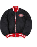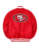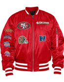 The Alpha Industries X San Francisco 49ers MA-1 Bomber Jacket features embroidered 49ers patches throughout the chest and sleeves with an embroidered applique team wordmark at the rear. Additional details include a utility pocket with the Alpha Industries ribbon at the left sleeve. The reversible jacket features a black interior with a screen-printed team logo at the left chest and a multi-lingual message at the rear.