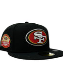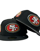 Presenting an exclusive custom San Francisco 49ers New Era fitted hat. 59Fifty high crown cap. It features an all-black color cap. team original logo in front. Candlestick Park stadium side patch on left mid panel. Tonal new era flag on right mid panel. Matching NFL logo man in the back. Gray under visor. Black sweat band. 100 percent polyester. Imported from Bangladesh.