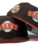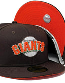 Celebrate your Thanksgiving with a fall colorway, a deep Brown San Francisco Giants custom New Era fitted hat from Sports World. 59Fifty high crown cap. it features an all-dark brown color cap. Front Giants logo in orange with green outline.  Baseball in white with brown outline. 2000 inaugural season side patch on left mid panel. Tonal New Era flag on right panel. Flat MLB batter man in the back. Orange under visor. white sweat band. 100 percent polyester. imported from China.